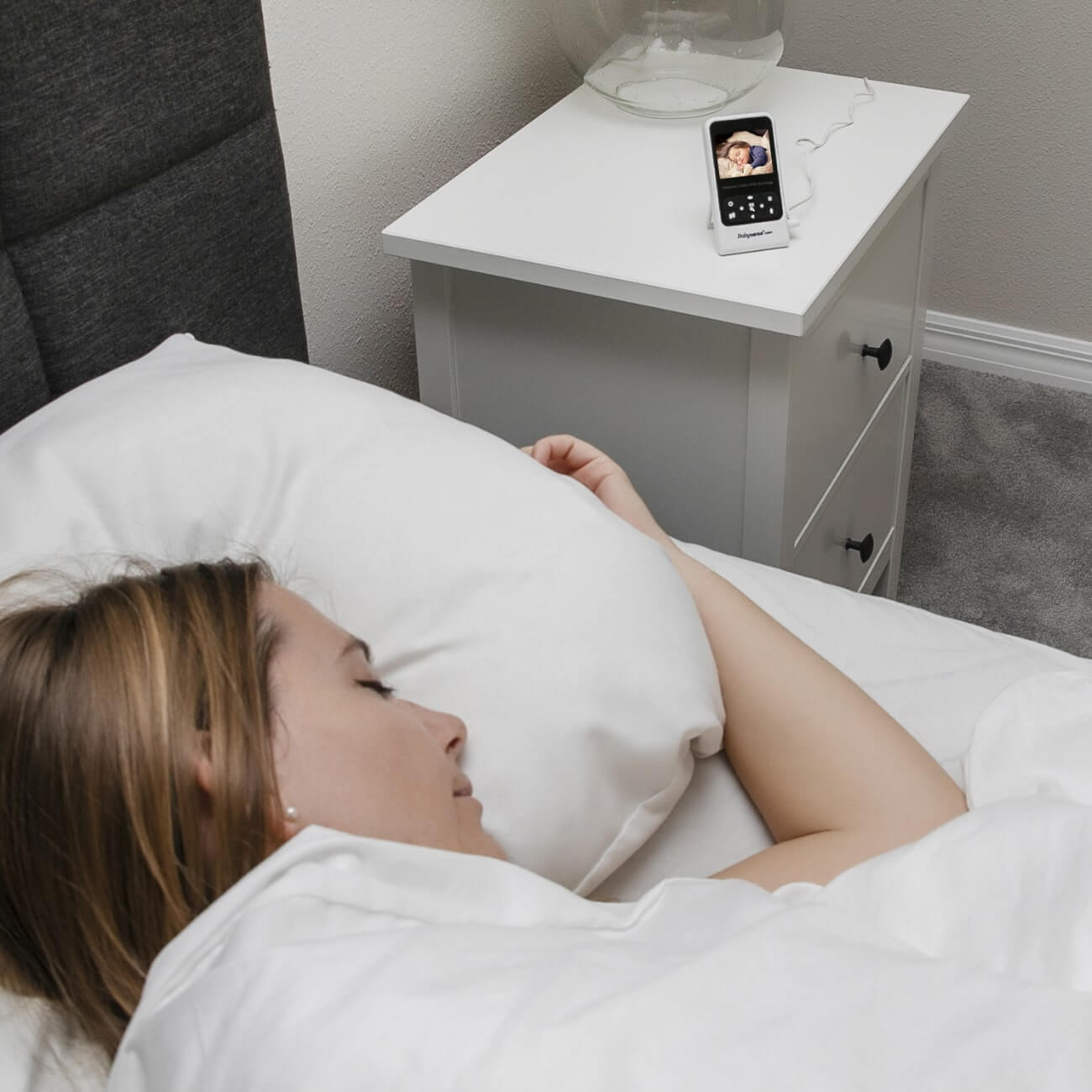 Most advanced 2-way talk back function, white noise sound and built-in lullabies help comfort and calm your baby, all from your hand-held monitor without leaving your bed!